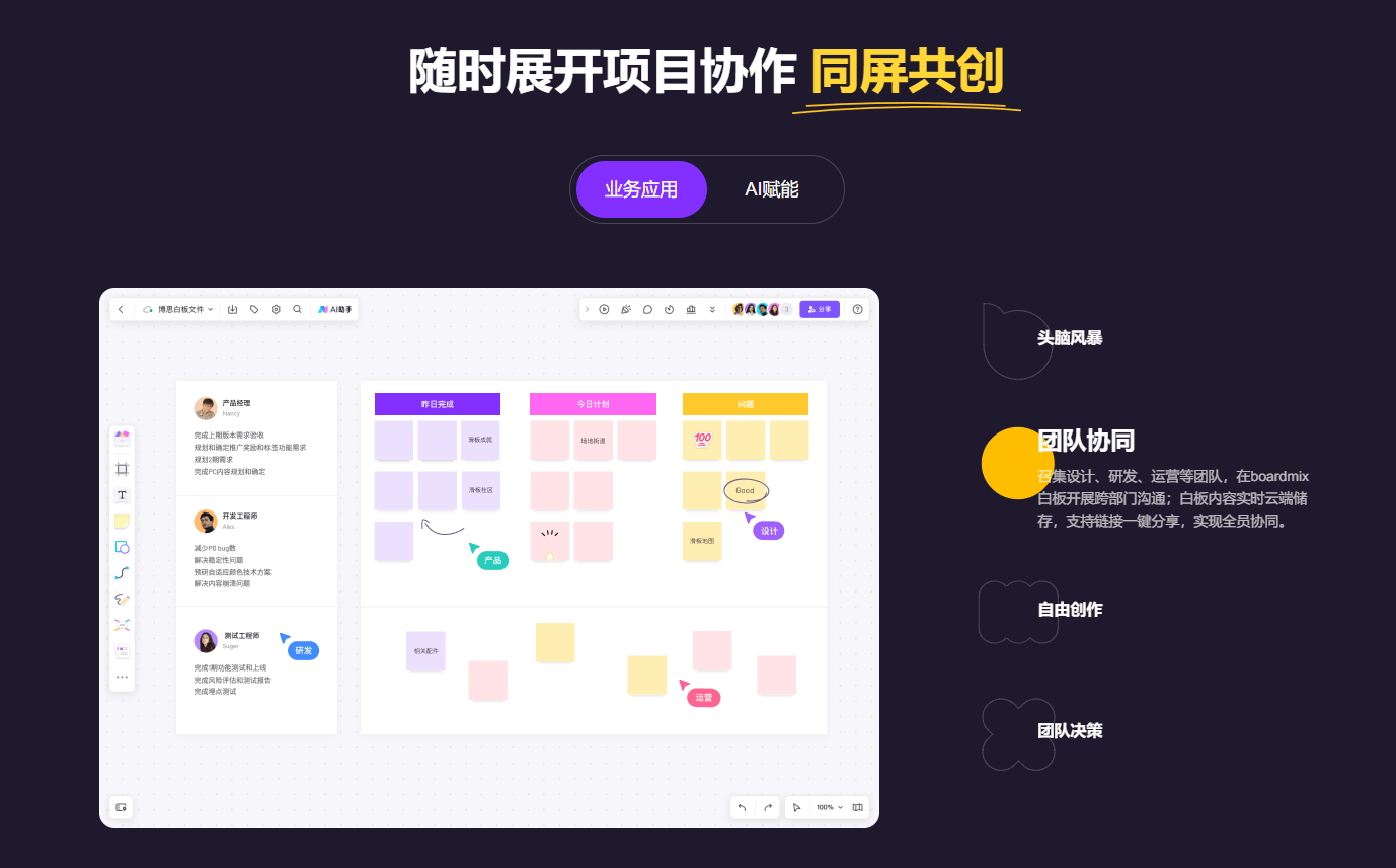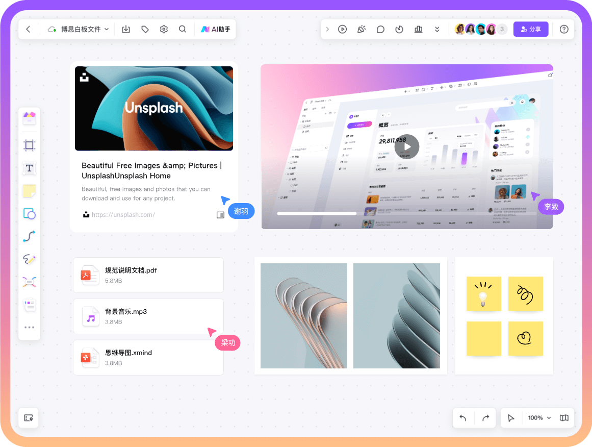 无限画布:boardmix博思白板供给了一个无限的画布,而且所有的内容都能够及时共享和协做。可正在Windows、macOS、Linux等多个平台上协同编纂文件内容。这也是现现在很多人配合面临的问题,用户需要留意模板和元素的版权问题,以连结每小我都领会环境,无需切换到其他使用。根据我们想要生成的内容,你也能够利用他们的平台!