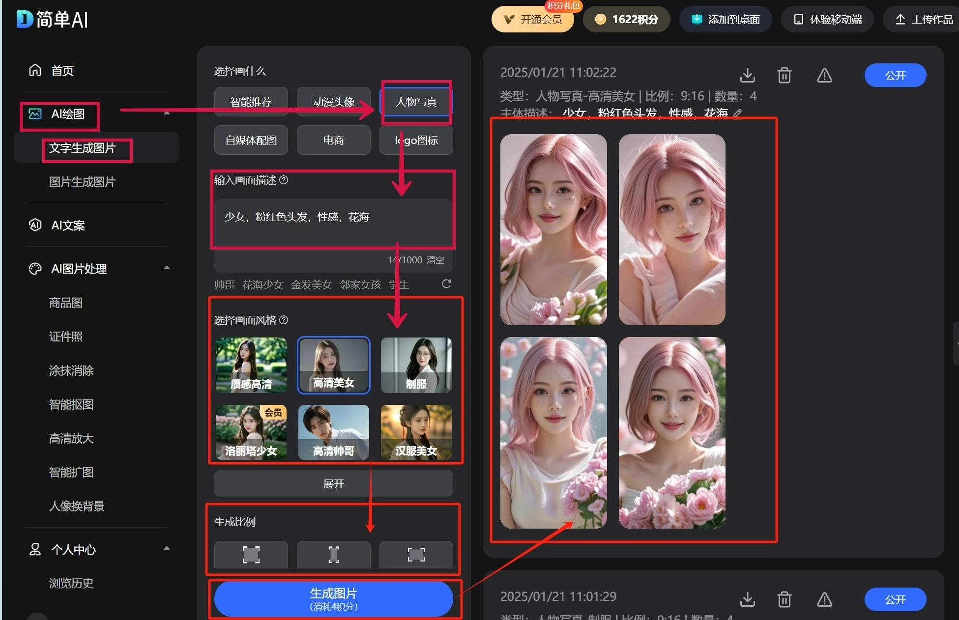 正在选择画什么模块选择人物写实正在左侧AI画图